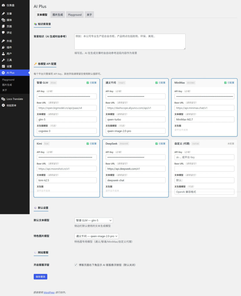 在内容创作越来越依赖 AI 的当下,如何将大模型能力无缝集成到 WordPress 网站,一直是很多站长的痛点。今天介绍一款深度使用并二次开发的插件——AI Plus,它集成了智谱 GLM、通义千问、MiniMax、Kimi、DeepSeek 等国内主流大模型,覆盖文章生成、翻译、SEO 优化、图片生成、客服浮窗等常用场景。