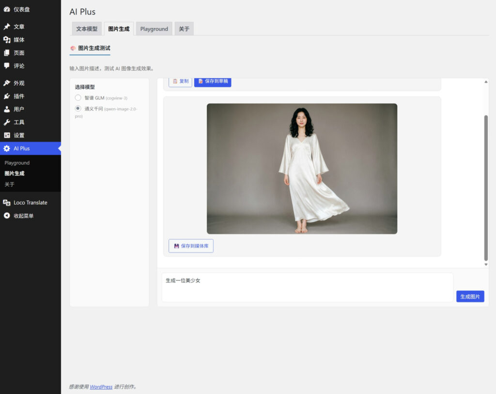 调用通义千问、智谱 GLM 或 MiniMax 的文生图模型,输入图片描述即可生成封面图,支持下载到媒体库并直接设为文章特色图。